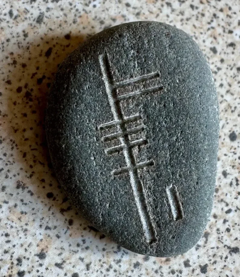 A pair of natural, water smoothed river pebbles with an engraving of ANY NAME requested - transliterated from English into Ogham, the primitive Irish alphabet - a superb token to be kept in a pocket, or proudly displayed.
