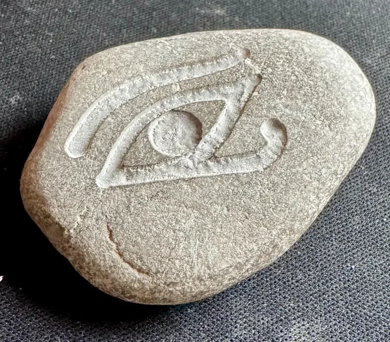 A natural, solid river stone pebble, engraved with The Eye of Horus symbol .. an ancient Egyptian symbol that represents healing, protection, and well-being - an all-seeing eye.