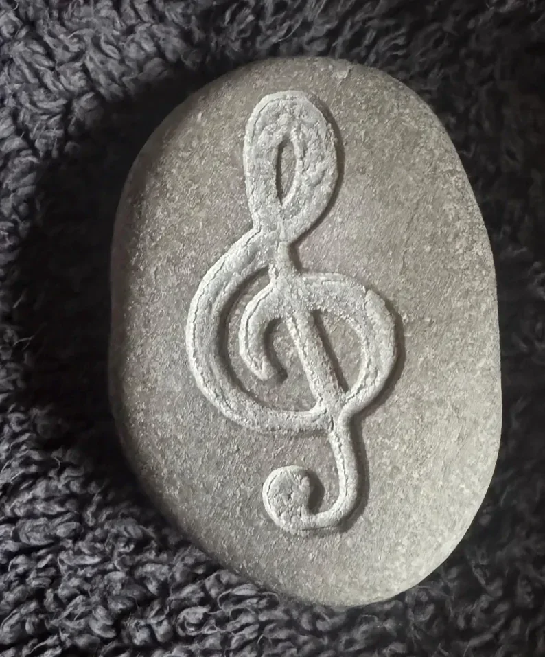 A natural, water smoothed river stone with an engraving of a classical musical note, treble clef - a superb momento and comfort to be kept in a pocket or purse, or simply proudly displayed .