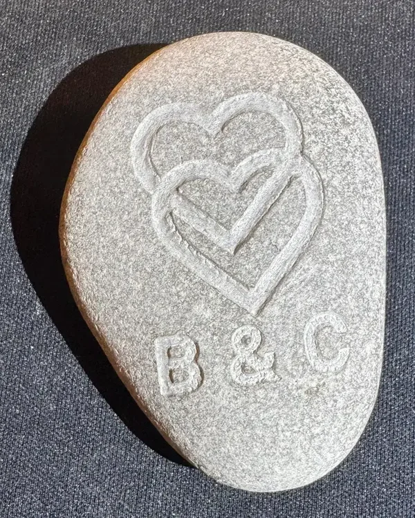 A small, natural, river smoothed stone engraved with interlocking love hearts with a pair of initials beneath.. making a superbly unique gift or present for any couple at any time .. anniversary, Birthday, Christmas, significant date.
