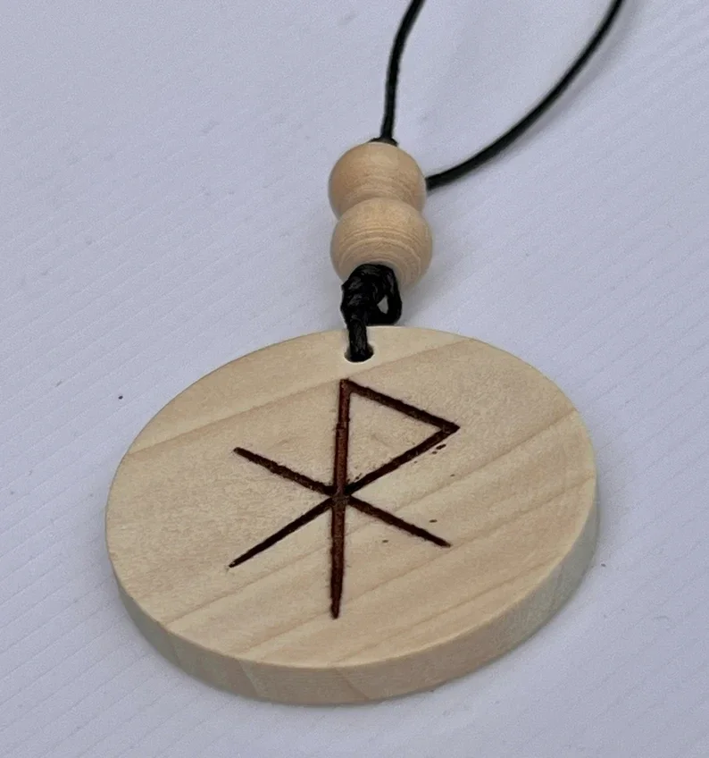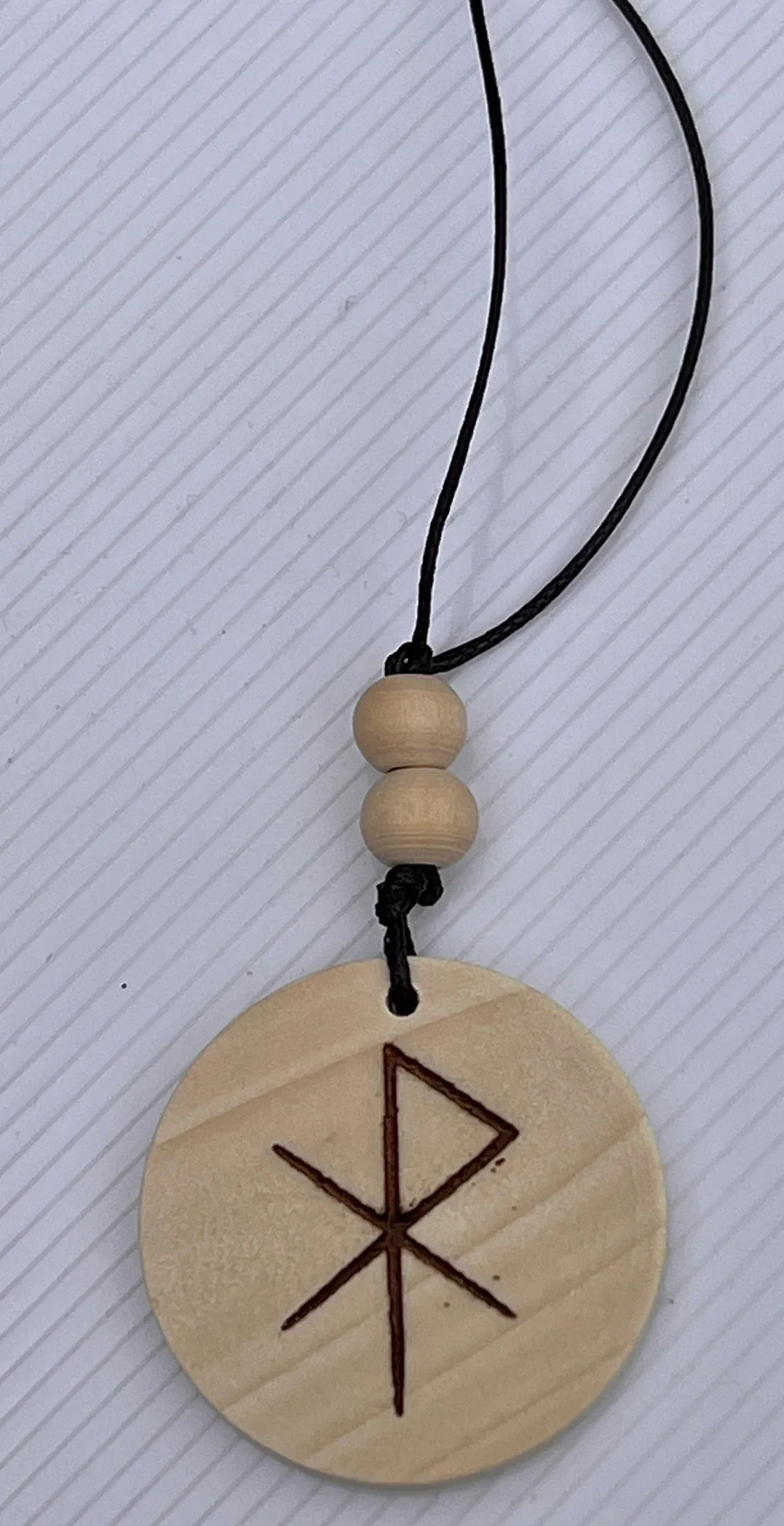 A hanger for a vehicle's rear view mirror made from a smooth wooden disc featuring an ENGRAVED Nordic bind rune symbol for safe travel to both sides. Suspended using thin waxed leather string through twin wooden beads.