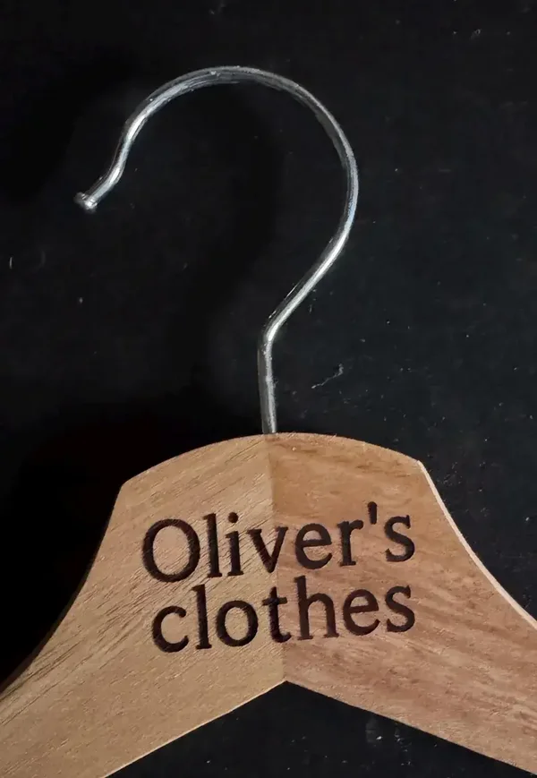 Brand new solid wood clothes hanger(s) - engraved to the centre space below the silver metal hook with ANY wording, name, date, title or occasion of your choosing .. e.g. any Christian name, any Christian name and surname, title e.g. Mr / Mrs / Miss / Ms / Dr / Bride / Groom etc / any occasion e.g. Wedding / Christmas / Anniversary, any Date e.g. 30.6.24. / Christmas 2024 etc.