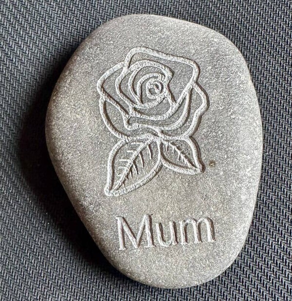A natural, solid river stone pebble, engraved with a detailed rose flower and leaf’s with “Mum” beneath - the ultimate symbol of love for Mother’s Day, or for any day.
