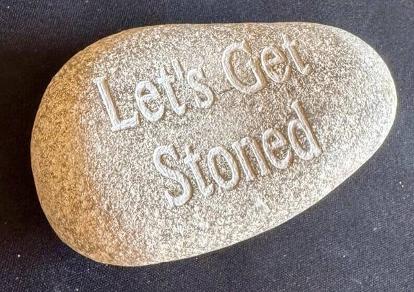 A natural, water smoothed river stone with the engraving “Let’s Get Stoned” - a fun item to be proudly proudly displayed inside or out.